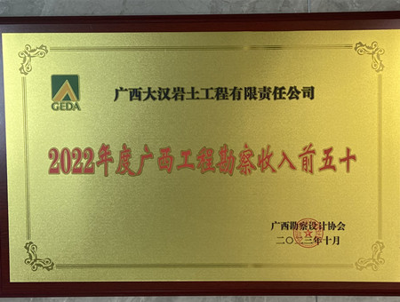 欽州市恒源岩土工程有限公司榮獲“2022年(nián)度廣西工程勘察收入前五十”