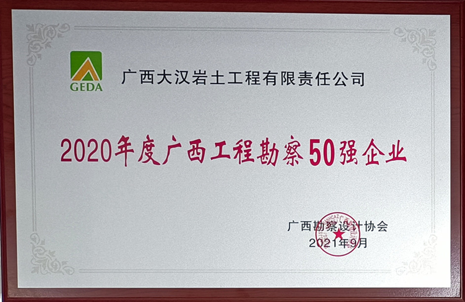 公司始終本着“專注岩土,鑄就品質”的(de)品牌觀,以“安全第一(yī)、質量至上、技術卓越、服務優良”理(lǐ)念完成各項工作任務,并取得優異的(de)成績,在2021年(nián)9月再次榮獲廣西勘察協會頒發的(de)“2020年(nián)度廣西工程勘察50強企業”榮譽稱号。